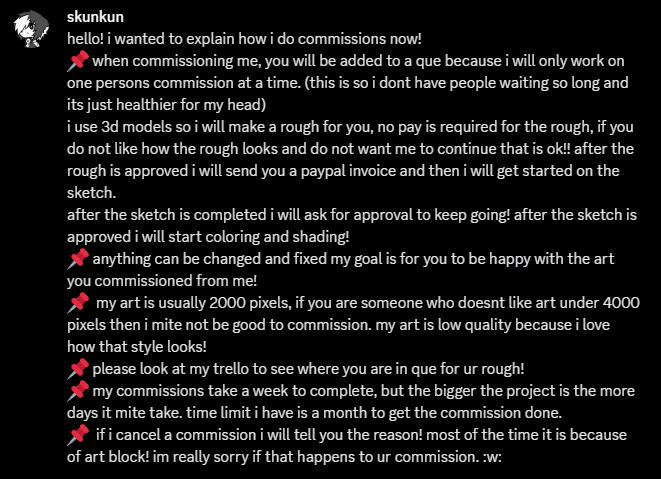 ➥ To-Do ListTo start a Commission with me, please approach me with a Commission detail or saying something like “Hello! Id like to purchase a Commission!”. This is so I can converse with you over a more business manner.- I will NOT charge you on how advance ur character is, wings ect will never have a + charge, i think thats stupid.- ! i do NOT Kink shame! i do have limits but i will not judge you for asking.- Any species, any body type, everything is on the table for me!